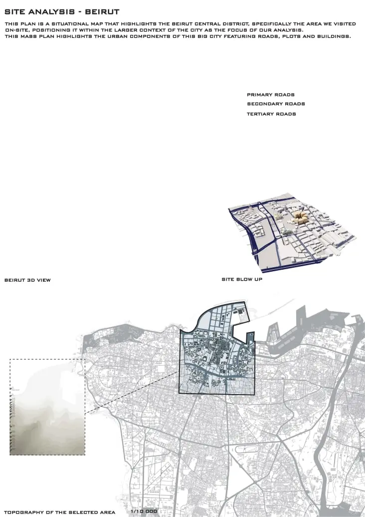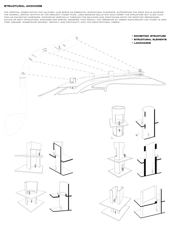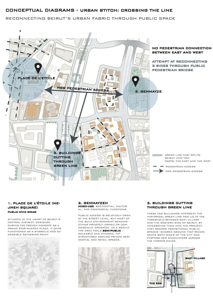 In this studio, we tackled the Solidere district at the heart of Beirut’s Martyrs’ Square, exploring urban-scale strategies to reconnect a city divided by its former Green Line. We analyzed pedestrian flows and historical layers, then proposed a network of corridors, sheltered plazas, and lightweight pedestrian bridges linking East and West Beirut. The masterplan was woven together through seamlessly fostering everyday unity and cultural exchange.